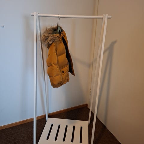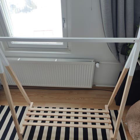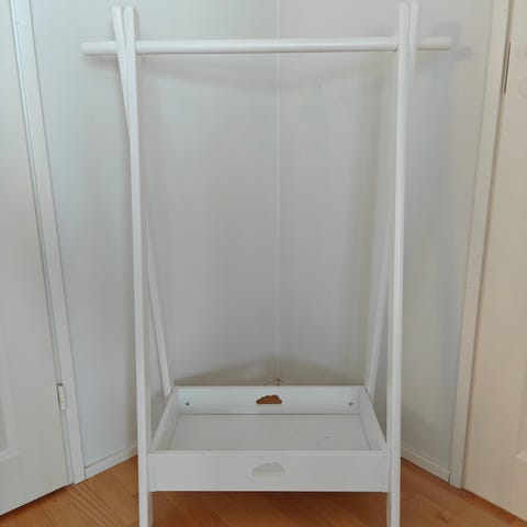 Kätevä vaaterekki esim lasten vaatteille. Maalattua puuta. Ruuveja voisi kiristää hieman sillä teline hieman huojuu. Toiminut kuitenkin käytössä hyvin.