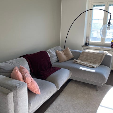 Jysk Vejlby divaanivuodesohva tummanharmaalla kangasverhoilulla. Sohvassa on L-mallinen divaaniosa ja selkänojan irtotyynyt. Vuodemekanismi mahdollistaa sohvan käyttämisen lisävuoteena. Verhoilukankaassa on näkyvä repeämä käsinojassa, joka on hyvä huomioida. Muut yksityiskohdat kuten mitat ja tarkempi materiaalikoostumus eivät käy ilmi.