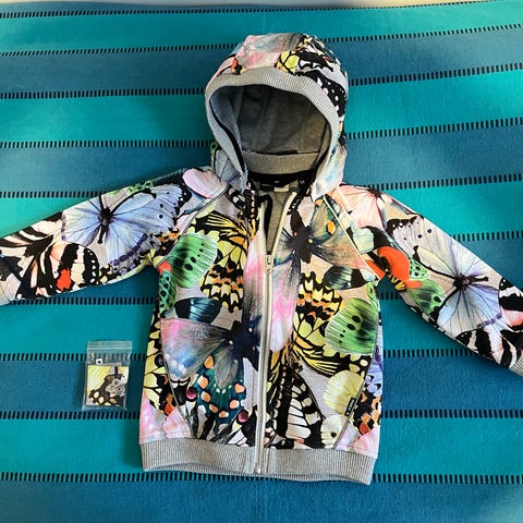 Kivaa materiaalia oleva takki. Pitkä käyttöikä, oli käytössä jo koossa 92. Siisti kunto, pari tahraa joita ei ole yritetty poistaa. Sulautuvat kuosiin, mutta voivat lähteä pesussa poiskin. Eivät ole meillä käytössä silmään osuneet.