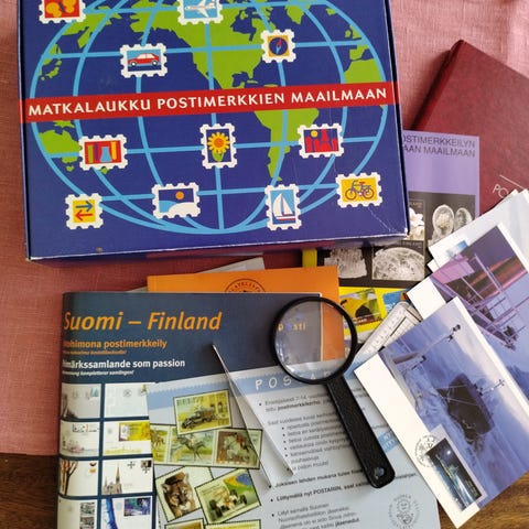 Joka sisältää hyvin moninaisia ohjekirjoja kuinka käsitellään postimerkkejä ja paljon muuta tietoa , mukana hammastulkki, suurennuslasi ja pinsetit, sekä muutama ensipäiväkuori ja paljon erilaisia postimerkkejä Suomesta ja ulkomaisia myös.