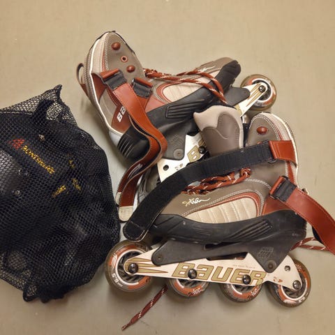 Mustat/tumman harmaat Rollerblade rullaluistimet. Kokoa ei näy, mutta kengän koko yleisesti 41-42. Pohjallisen mitta noin 25 cm.