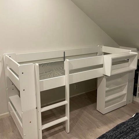 Halutessaan mukaan saa siistin valkoisen patjan, joka sopii sänkyyn (ostettu Ikeasta tai Jyskistä, en ole täysin varma).