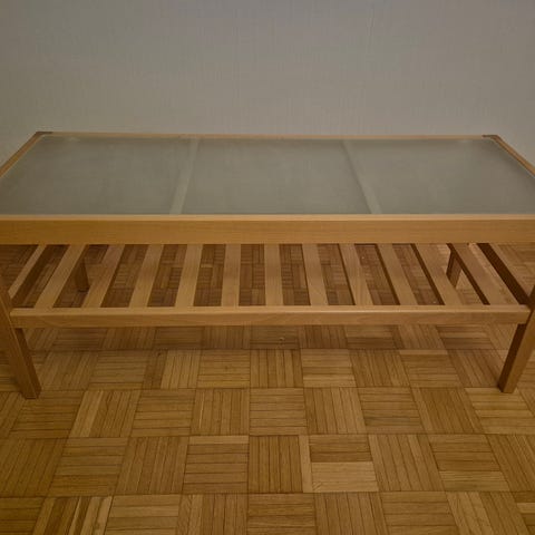 Siisti ja tukeva puinen sohvapöytä lasipinnalla. Toimitusmahdollisuus edullisesti.