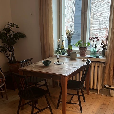 Hiljattain peruskunnostettu 1960 luvun tammipöytä, hiottu, liitokset vahvistettu ja maalattu. Ei minkaanlaista keikkumista!