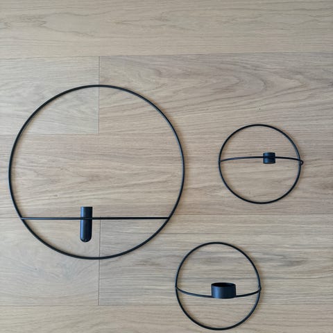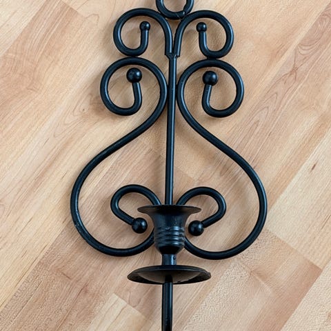 Seinäkynttilänpidike metallia. Musta, kaareva malli, jossa koristeellinen läpikuviollinen selkäosa ja pyöreä alusta kruunu- tai pilarikynttilälle. Kiinnitetään seinään yläosassa olevasta kiinnityskohdasta. Sopii sisäkäyttöön tunnelmavalon tuojaksi tai osaksi sisustusta.
