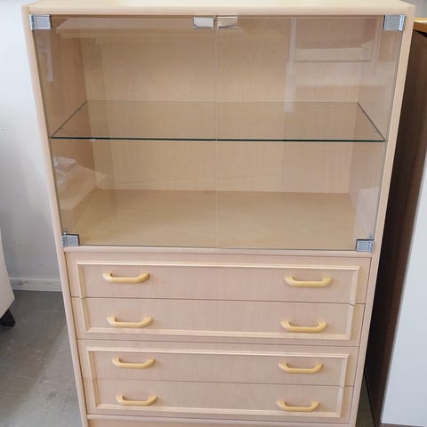 Pienen tilan hyllykkö, jonka alaosassa on 4 vetolaatikkoa. Pinnoilla on käytönjälkiä.