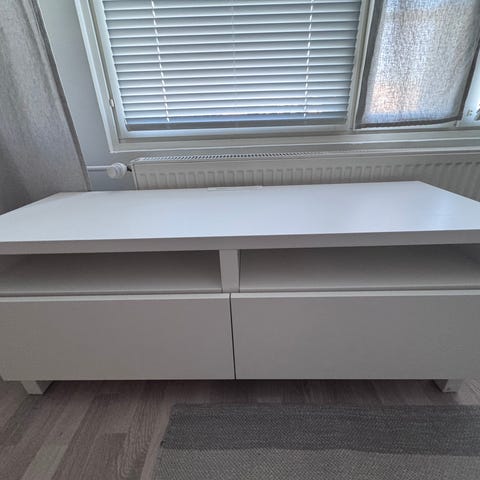 Mustanruskea Ikean Bestå tv-taso, kahdella valkoisella laatikolla ja kahdella hyllytasolla. Laatikoissa ponnahdusmekanismi. Hyväkuntoinen, tason pinnassa joitakin pieniä käytönjälkiä.
