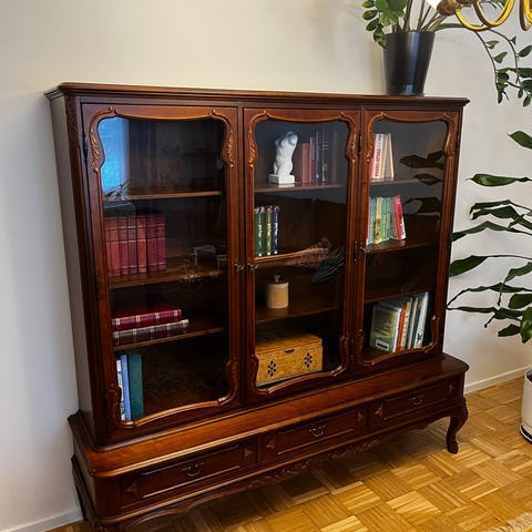 Hakusanat: huonekalut, antiikkinen, ovi, vintage, lasiovet, retro, käytetyt huonekalut, rokokoo, vintage huonekalut, säilytys, koristeelliset jalat, vetolaatikko, kaappi, kaapit, hylly, kaapisto, chippendale, hyllyt, taso, levy, huonekalu