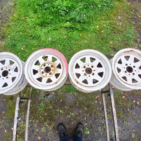 Neljä kappaletta 5x13 vanteita, vaatii maalausta.