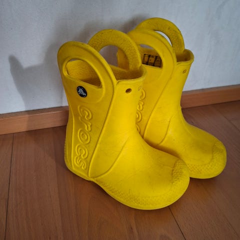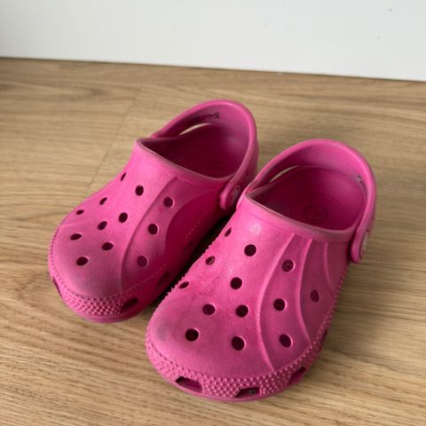 Mustat crocsit koko 25. Toisessa kengässä korjattu nilkkalenkki mustalla kuminauhalla.