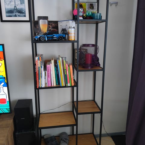Oikein hyväkuntoinen, näppäränkokoinen avohyllykkö. Pinnat ovat siistit.