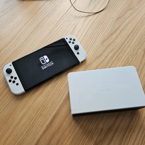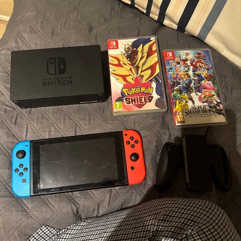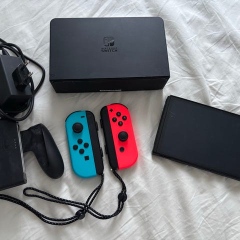 Nintendo Switch -pelikonsoli, jossa neonpunainen ja neonsininen Joy-Con -ohjain. Mukana telakka televisiopelaamista varten, kantokotelo konsolin säilytykseen ja kuljettamiseen sekä useita lisävarusteita, kuten erillinen ohjain ja rannekkeet Joy-Con -ohjaimille. Kuvissa näkyy myös useita Nintendo Switch -pelejä pelikokoelmaa varten. Kokonaisuus soveltuu sekä kannettavaan pelaamiseen että pelaamiseen televisioon liitettynä.