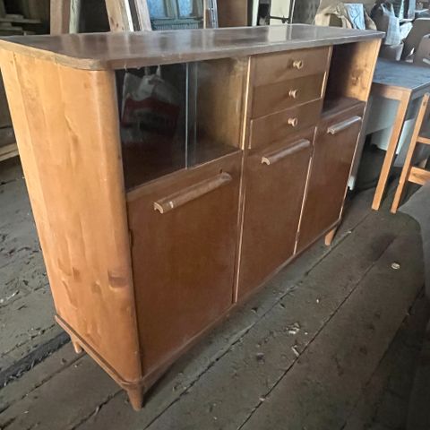 Antiikkinen massiivipuinen senkki. Senkin maalipinnassa ajan patinaa. Tukeva ja ehjä. Vitriiniovien lasit uusittu.