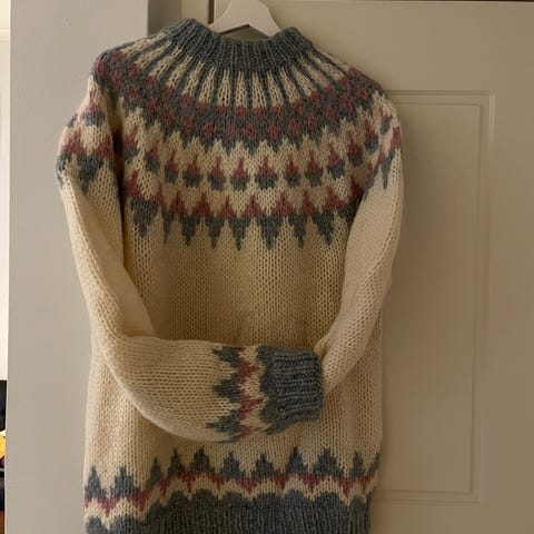 Myydään Islantilainen villapaita. Koko M/L. Paita on neulottu lettlopi-langasta. Korotettu niskasta, jossa myös narut. (Kuten kuvassa näkyy).