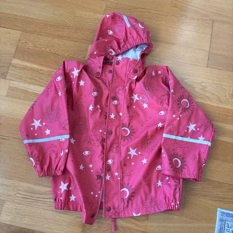 Myydään settinä Cirafin vuoreton sadetakki ja samanlaiset vuorettomat rukkaset, koko 116.