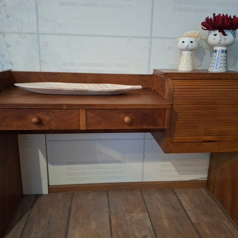 Kotimainen 70-luvun Askon kampauspöytä.Materiaali umpikoivua,kevyt ja kestävä.Siisti ja hyväkuntoinen.Näppärä koko 93×45×67cm.Kalusteeseen kuuluva kaunis tuoli kuuluu kauppaan.