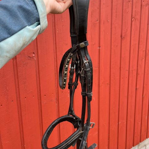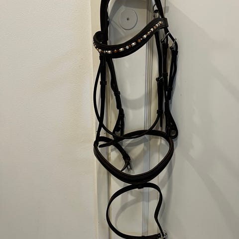 Mustat suitset, joissa pehmeä niskahihna ja musta-valkoinen pullback turparemmi. Ei otsapantaa mukana. Käytetyt, valkoisissa osissa hieman pinttynyttä likaa.