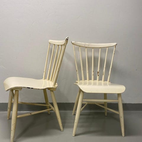 Teak istuimella varustettu vintage pinnatuolit myytävänä. Rungot ja liimaukset molemmissa hyvässä kunnossa. Maalissa käytön jälkiä. Istuinkorkeus 44 cm. Myydään parina.