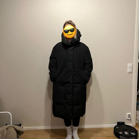 Marimekko naisten talvitakki, koko M. Pitkä musta untuvatakki, jossa tikattu pinta. Edessä vetoketju ja painonappikiinnitys. Takissa on korkea kaulus ja säädettävä kiristysnyöri helmassa. Materiaalina untuva 80% ja höyhen 20% päällyskangas polyesteriä, joka tarjoaa lämpöä kylmiin säihin. Soveltuu arkeen ja ulkoiluun talvikaudella.