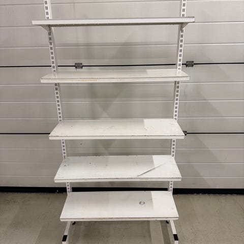 Myymälähyllyt vanhan Marimekon myymälästä, 2 kpl. Hyllyssä on alla pyörät, jotka helpottavat siirtämistä. Toisesta hyllylevyt puuttuuvat, toisessa hyllylevyt ovat lasia ja runko metallia. Muotoilu on moderni ja leikkisä, mikä tekee siitä erottuvan sisustuselementin.