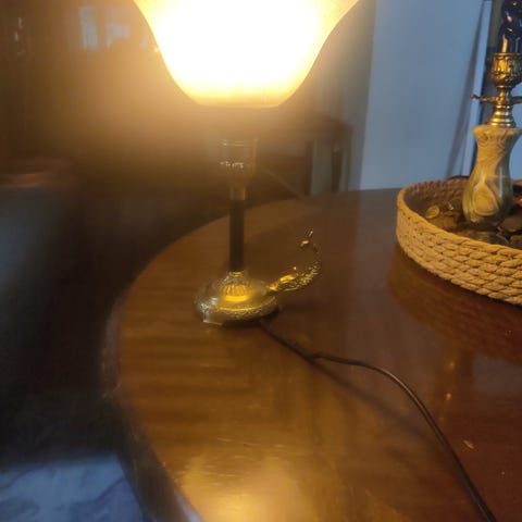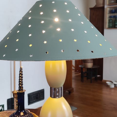 Mosaiikki keramiikka jalallinen pöytävalaisin. Valaisin toimiva ja hyvä kuntoinen. Valkoinen kangas varjostin jossa kulta koristeita. Valaisimen korkeus varjostimen kanssa 40 cm.