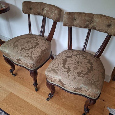 Kaksi uusvanhaa (~1980-luku) napoleontuolia. Erinomaisessa kunnossa ja täysin tahrattomia. Verhoiltu uudelleen 2000-luvulla.