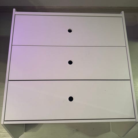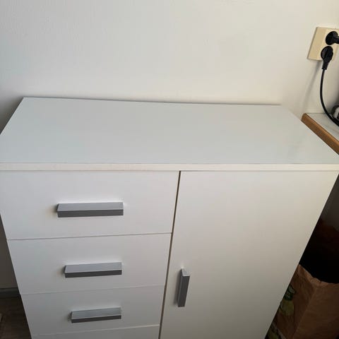 Lipasto, jossa on kahdeksan laatikkoa. Lipasto sopii esimerkiksi makuuhuoneeseen, lastenhuoneeseen tai eteiseen pientavaroiden ja vaatteiden säilytykseen. Kuvissa näkyy joitakin käytön jälkiä ja pieniä naarmuja laatikoiden pinnoissa.