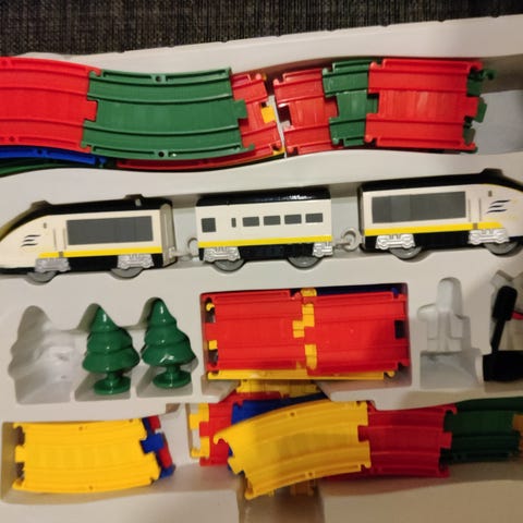 Valoilla ja äänillä oleva lelujuna tuomas veturi. Käy puu junarataan