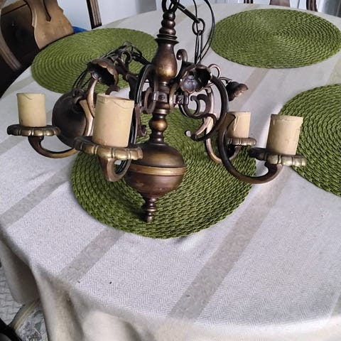 Noin 100-vuotias, 6-haarainen kattokruunu, messinkiosat ehjat, sähköosat on uusittavat.