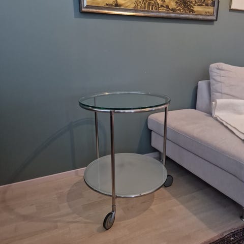 Kaksitasoinen pyöreä savulasinen olohuoneen pöytä. Pöydän jalat ovat kromatut. Pöydän halkaisija 85 cm ja alemman tason halkaisija 69 cm. Vain nouto Espoo Olari