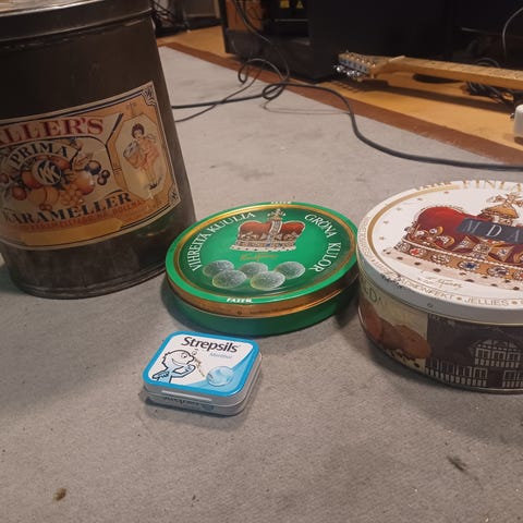 Sinisiä lasipalloja alumiinipurkissa
