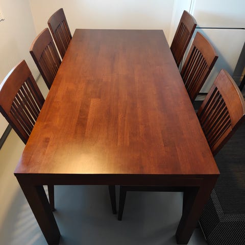Ruokailuryhmä on ollut vähäisellä käytöllä ja on hyvässä kunnossa. Pöydän kansi on siisti ja rakenteet tukevat.