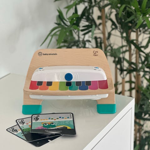 Lelu koostuu värikkäästä pianonmuotoisesta leikkimatosta ja äänilaitteesta.