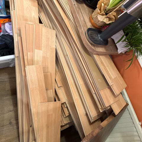 Meiltä loppui laitteista teho ja jaksaminen, ehkä sinulta ei? Annetaan siis poiskantohinnalla n. 12m2 tammiparkettia joista osa pelastettavissa, mutta älä laske että kaikki olisi varmasti käyttökuntoista.