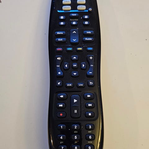 Logitech Harmony kaukosäädin telakalla. Kaukosäätimessä on värinäyttö ja useita painikkeita eri laitteiden ohjaamiseen. Mukana lataustelakka, johon kaukosäädin asetetaan pystyyn latausta varten. Väri on musta. Soveltuu viihde-elektroniikan, kuten television ja muiden yhteensopivien laitteiden, ohjaamiseen yhdellä kaukosäätimellä.