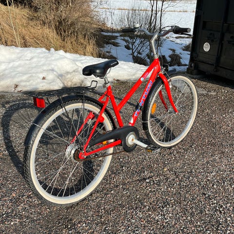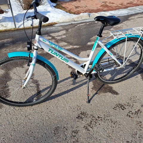 Kuvan mukainen Tunturi 26” nuorten polkupyörä. 7 vaihdetta, koko sopiva noin 140-155 cm pyöräilijälle. Pyörässä on leveät renkaat, jotka soveltuvat kaupunki- ja arkiajoon. Kuvista näkyy matala runkomalli, tavarateline takana, lokasuojat sekä ketjusuoja. Runkolukko kahdella avaimella ja seisontatuki
