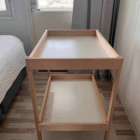 Valkoinen hoitopöytä, jossa ylhäällä korotetut laidat hoitoalustalle. Pöydässä on yksi vetolaatikko ja pari ritilähyllyä vaippojen, vaatteiden ja muiden tarvikkeiden säilytykseen.