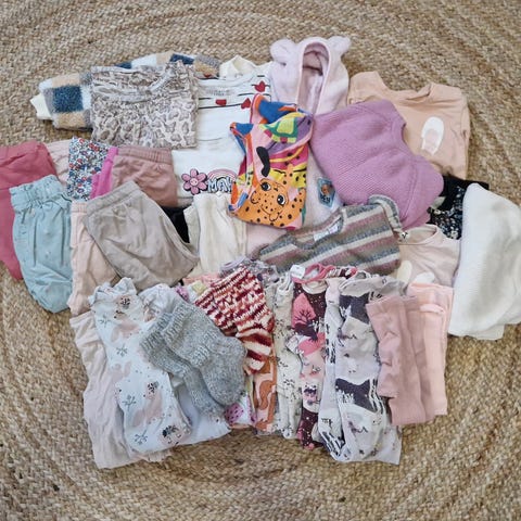 Hyväkuntoinen vaatepaketti koko 80-92. Löytyy uusia vaatteet takit 2kpl, v.punaiset ja beige karvatakki ja myssy ja ruokalappu.