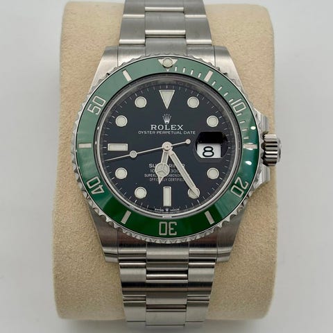 Mukaan alkuperäinen laatikko, rannekkeen jatkopala, Rolexin huollon takuukortti, Rolexin huoltokirja, digitaalinen aitoustodistus (QR-koodilla) ja todistus tiiviystestistä.