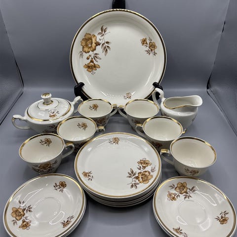 Hakusanat: lautaset, lautanen, teekannu, arabia, arabian, kahvi, design kuppi muki kupit lautanen astiasto kahviastiasto tassi asetti lautaset kupit mukit, kupit, kultareunus, kuppi, Paketoitava, muki, Valmistaja, aterin, myrna, tarjoilulautanen, kukkakuvio, keramiikka, suomalainen muotoilu, sokerikko, kermakko, aterimet, astiasto, astiat, kaadin