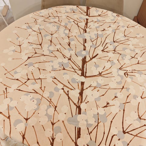 Kerman/ vaalean beigen sävyiset Marimekko Lumimarja verhot.