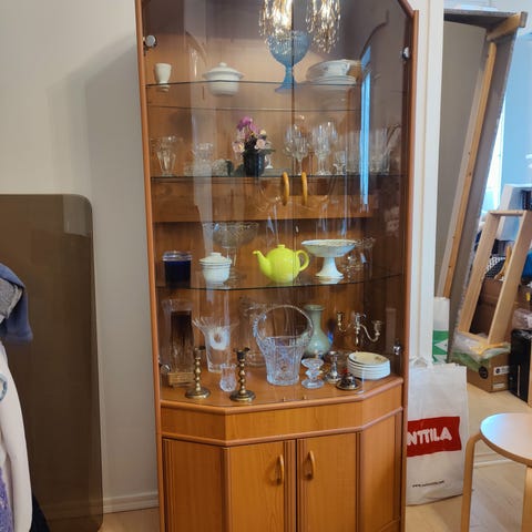 Kuvan vitriinikaappi myytävänä. Mukana tulee kaapin lasiset välilevyt.