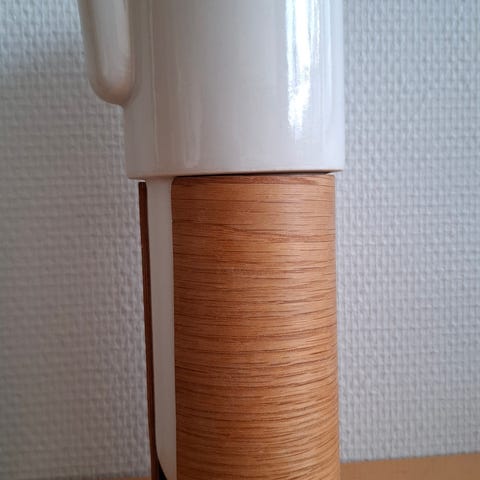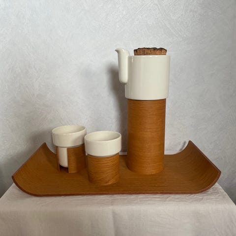 Tonfisk Design teekalusto. Settiin kuuluu puu- ja valkoisista osista koostuvia astioita, kuten teekannu tai -muki sekä kuppeja ja metallinen sihti. Astioissa on valkoinen keraaminen osa ja puinen ulkopinta, ja ne on pakattu alkuperäiseen laatikkoon. Soveltuu teen tai muiden kuumien juomien tarjoiluun.