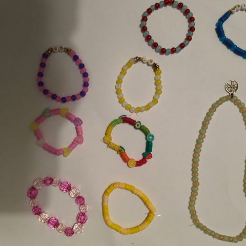 Poika myy tekemiään käsikoruja ja kaulakoruja.