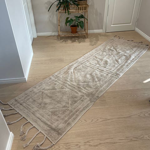 Linumin kaunis ja laadukas Loom-sarjan matto, väri meleerattu puna-valkoinen. Materiaali 100 % puuvillaa. Maton voi pestä 60 C:ssa. Koko n. 70 cm x 160 cm. Molemmissa päissä punainen 5 cm leveä vahvike. Matto on melko paksu, mikä tekee siitä jämäkän tuntuisen. Matto on ollut vähällä käytöllä, joten se on todella siistissä kunnossa, lähes kuin uusi. Hinta 75€. Nouto Espoo / Helsinki (esim. Lippulaiva / Espoontori / Sello / Kamppi / rautatieasema).