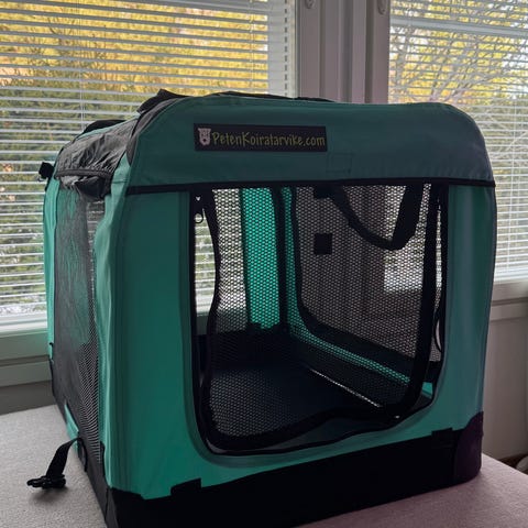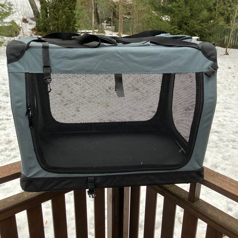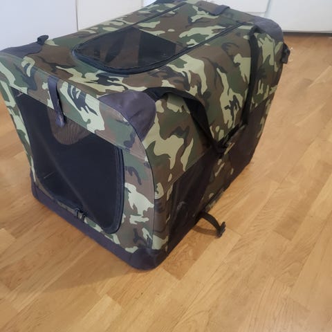Pohjolan lemmikkitarvikkeen kevythäkki. Itselle tuli tilattua liian suuri 😊 Sivustolta lainattu teksti: Sininen kangas koirankuljetuslaukku L-koko, mitat noin 70 x 52 x 50 cm. Laukussa on useita verkkopaneeleja ilmanvaihtoa ja näkyvyyttä varten sekä vetoketjulliset aukot. Kyljessä on tasku pienten tarvikkeiden säilytykseen. Laukussa on kantokahvat helpottamaan siirtämistä. Soveltuu esimerkiksi keskikokoisille koirille noin 10–18 kg painoluokassa, kuten bordercollie. Sopii käytettäväksi kotona lepo- ja häkkiratkaisuna tai matkustamiseen autossa ja sisätiloissa.