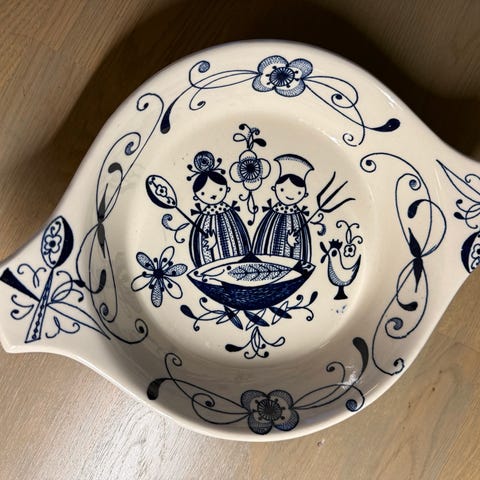 Stavangerflint-valmistajan "Mesterkokken"-sarjaan kuuluva käsinmaalattu, tulenkestävä keraaminen kattila, jonka on suunnitellut Inger Waage.