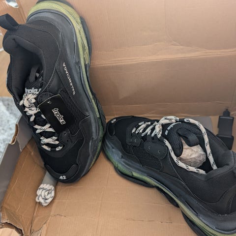 Balenciaga tennarit, koko 44. Väriltään mustat. Päällinen näyttää kuvien perusteella nahkaiselta, nauhakiinnitys ja kumipohja. Kengissä Balenciaga-logot sisäpohjassa ja ulkopohjassa. Soveltuvat arki- ja vapaa-ajan käyttöön.