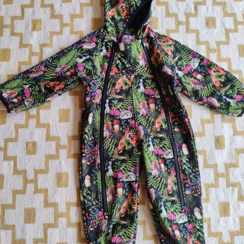 POMPdeLUX Softshell-haalari, koko 86. Väri tummansininen kuviolla. Materiaali polyesteriä. Haalarissa on huppu, pitkät hihat ja lahkeet sekä edessä pitkä vetoketju helpottamassa pukemista. Polvissa ja takapuolessa on vahvikekangasta. Unisex-malli, sopii sekä tytöille että pojille ulkoiluun sään mukaan kerrostettuna. Vettähylkivä ja tuulenpitävä.