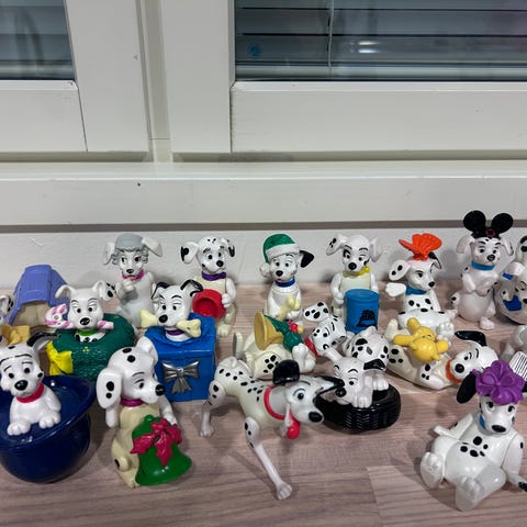 Walt Disneyn 101 dalmatialainen koira vuodelta 1965. Pehmeää muovia. Ajanmukaista kulumaa. Ja nenässä punaista (näkyy kuvassa). Pohjassa teksti Walt Disney.